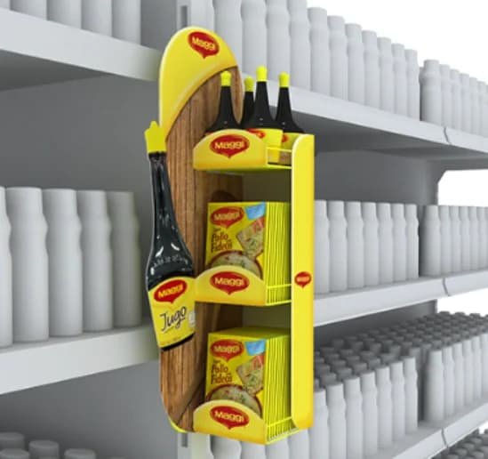 Posicionado perpendicularmente à gôndola, ele cria um ponto de interrupção — um “obstáculo positivo” — que se projeta no campo de visão do consumidor.